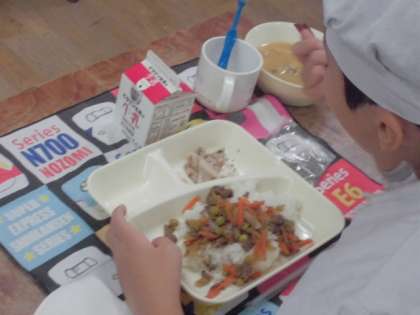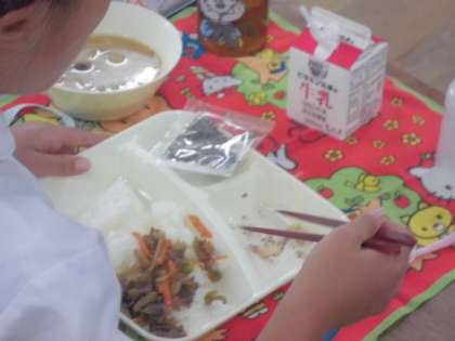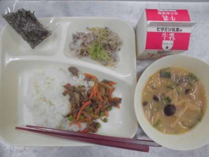 今日の給食のメニューは牛肉のきんぴらちらし、みそ汁、キャベツの赤じそ和え、牛乳、ごはん、でした。牛肉のきんぴらちらしは米酢の酸味が効いていて、ささがきされたごぼうと牛肉、にんじんが少し甘辛く味付けられていましたが。ごはんと合わせて食べるとちょうどよいおいしさでした。みそ汁はだしがしっかりととられていて、やさしい味に仕上がっていました。たまねぎ、うすあげ、しめじ、青ネギが入っていました。キャベツの赤じそ和えはしその香りがただよいさっぱりとしていました。