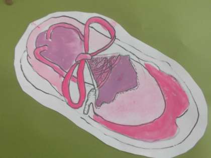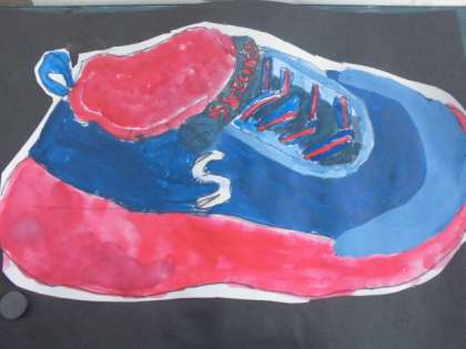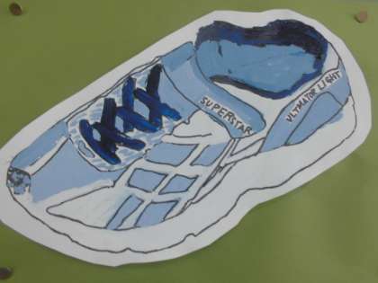 3年生の教室の後ろに子どもたちが描いたくつが掲示してありました。よく見て頑張って描いたようすが伝わってきます。
