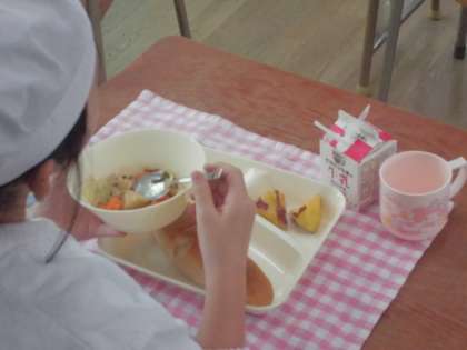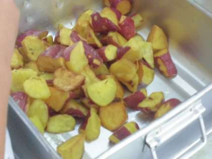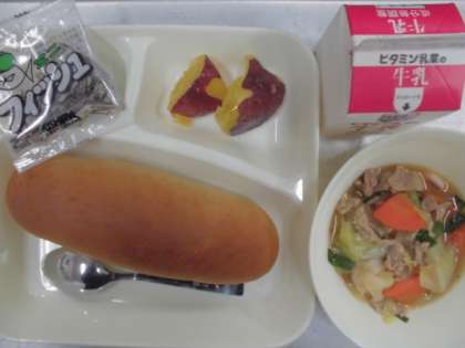 今日の給食のメニューは豚肉といかの中華煮、大学いも、ミニフィッシュ、牛乳、パン、でした。豚肉といかの中華煮は八宝菜のような感じでとろみがつけられていて、具材もたくさん入っていました。いかの風味がしっかりと感じられました。彩りもきれいでした。大学いもは手作りの甘いみつが、油で揚げられたやわらかいさつまいもにほどよくからんでいておいしかったです。ミニフィッシュは一人一袋です。