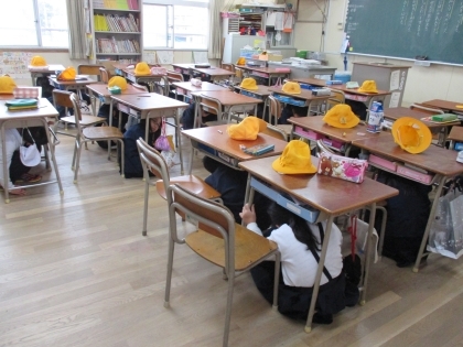 地震がおきたときは、体を守るために机の下に潜り込みます。揺れがおさまったところで運動場に一次避難します。津波のおそれがあるときは、校舎の3階に二次避難します。