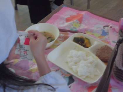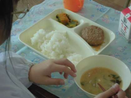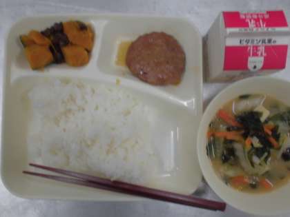 今日の給食のメニューは和風ハンバーグ、みそ汁、かぼちゃのいとこ煮、牛乳、ごはん、でした。和風ハンバーグはやわらかい食感のハンバーグにとろみがついた和風仕立てのソースがかけられていました。みそ汁はだしがしっかりととられていて具もたくさん入っていました。いつも通りのやさしい味でした。かぼちゃのいとこ煮は自然の甘さが感じられました。いとこ煮はかたくて時間のかかる材料を順に入れて煮るところから「おいおい(甥甥)煮る」といって「いとこ煮」と呼ばれるようになったと言われています。