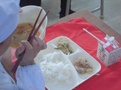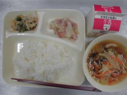 今日の給食のメニューは鶏肉のゆず塩焼き、ソーキ汁、もやしと三度豆の甘酢和え、牛乳、ごはん、でした。鶏肉のゆず塩焼きはゆずの香りがしっかりと感じられ、鶏肉もやわらかくておいしかったです。焦げ目もあり香ばしさもありました。ソーキ汁はこんぶのだしがしっかりととられていて味に深みがあり、豚肉の旨みも効いていました。細かくていねいに刻まれたにんじんや大根、えのきも入っていました。沖縄の代表的な料理です。もやしと三度豆の甘酢和えは米酢の酸味でさっぱりとした口あたりでした。