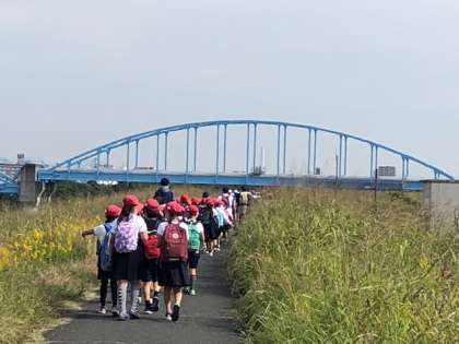 素晴らしい秋空の中、3・4年生が遠足です。今年度初めての校外活動、城北公園に向かいます。場所は近いですが、子どもたちはウキウキしています。