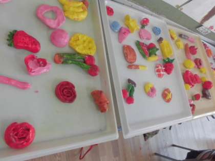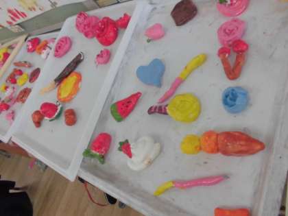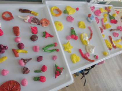 1年生の教室の後ろのロッカーの上に、1年生の子どもたちが作った??が置いてありました、ねんどで作ってあって、色もていねいにぬってありました。ケーキやキャンディなどの食べ物もありましたが、飾りや模様のようなものもありました。何かはよくわかりませんが、子どもたちが一生懸命に作っているようすが伝わってきました。何に使うのでしょうね。