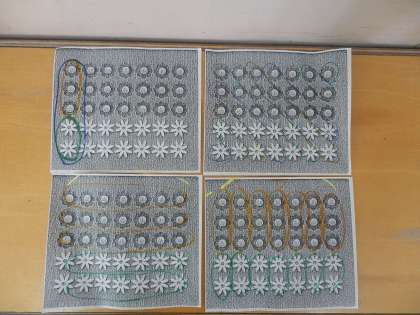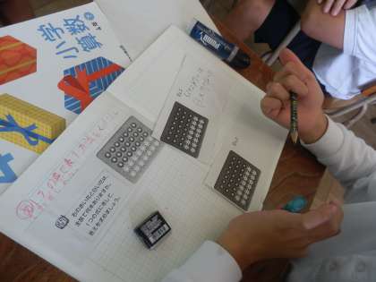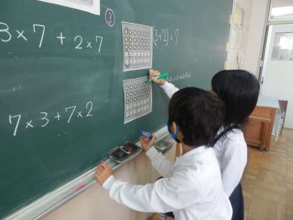 4年生の算数は、計算のきまりをつかって、花の数を求める方法を考えました。ペアやグループで協力して、いろいろな考え方を発表することができました。