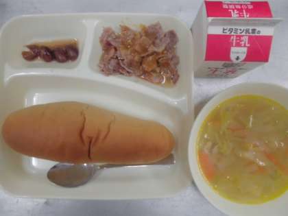 今日の給食のメニューは豚肉のデミグラスソース、スープ、うずら豆のグラッセ、牛乳、パン、でした。豚肉のデミグラスソースは濃厚なデミグラスソースがしっかりと豚肉にからまっていて味に深みが感じられました。スープはチキンスープをベースに塩こしょうで味がととのえられていて、鶏肉、にんじん、たまねぎ、大根、キャベツ、グリンピースが入っていました。うずら豆のグラッセはうずら豆が砂糖とバターで甘く煮られていてデザートのようでした。うずら豆は皮に黒色のまだらもようがあり、このもようがうずら卵のからやうずらという鳥の色合いに似ていることから、この名前がついたそうです。
