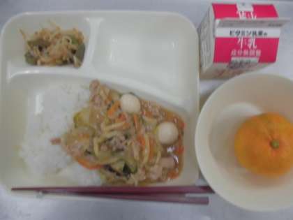今日の給食のメニューは中華丼、もやしと三度豆の中華和え、みかん、牛乳、でした。中華丼はしいたけのもどし汁を使っているので味に深みがあり、ちょうどよいとろみ具合でおいしかったです。具材もたくさん入っていて、たけのこの食感も楽しめました。もやしと三度豆の中華和えはごま油の香りが効いたしょうゆベースのたれがかかっていましたが、さっぱりとした感じでした。みかんは果汁があり甘かったです。