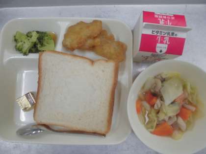 今日の給食のメニューは白身魚のフリッター、洋風煮、ブロッコリーのサラダ、牛乳、パン、でした。白身魚のフリッターは身はふっくらとやわらかく、ころももサクッと揚げられていました。洋風煮は鶏肉、にんじん、たまねぎ、キャベツ、でぼ豆が入っていて、スープが味に深みがありコクが感じられました。ブロッコリーのサラダはリンゴ酢を使ったドレッシングがかけられていて、ほんのり甘さも感じられました。