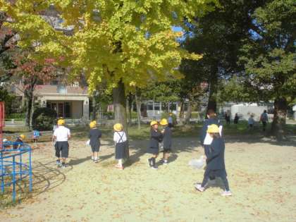 子どもたちは「せんせい、みてみてー、この色きれいだよー」「おおきいのみつけたー」「このきいろいのはいちょうのはっぱだよー」「どんぐりあるかなー」・・・子どもたちは楽しそうに公園の中を歩き回っていました。持っていったふくろの中におちばを集めていきます。あとで何かつくるのかな?