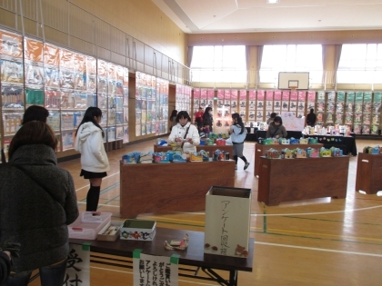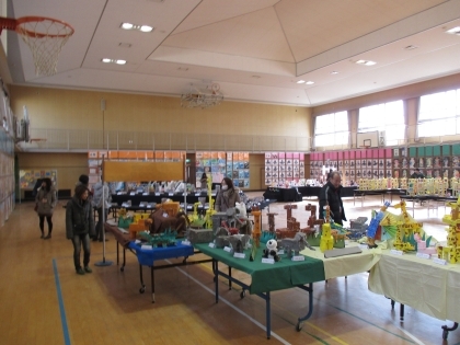 土曜授業として作品展を開催しました。講堂に展示された絵画と工作はどれも力作ぞろいです。前日には子どもたちも鑑賞しましたが、この日は保護者の方々がたくさん見に来られました。