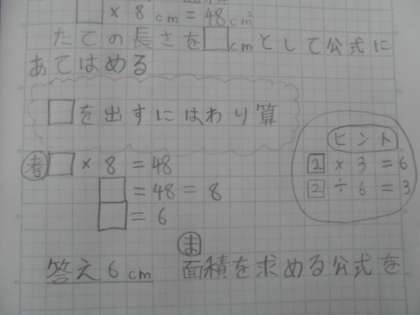 面積が48平方cmで横の長さが8cmの長方形をかくには、たての長さを何cmにすればよいですか。4年生が算数の授業で面積の学習をしていました。わかっている面積から反対にたての長さを求める問題です。□をつかった式を考えていました。