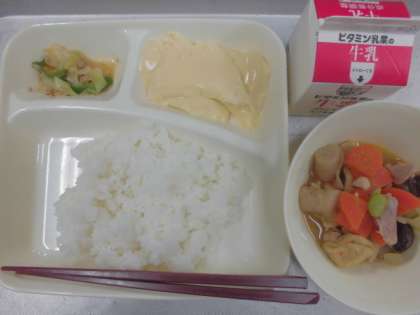 今日の給食のメニューは卵どうふ、鶏肉と一口がんもの煮物、野菜のそぼろ炒め、牛乳、ごはん、でした。卵どうふはだしが効いていてやわらかく、口の中でとろけるような食感でした。鶏肉と一口がんもの煮物は甘めの和風だしにしいたけのもどし汁で味に深みを出し、具材にもしっかりと味がしみ込んでいました。野菜のそぼろ炒めはみその香り豊かにピーマン、キャベツと一緒に豚挽き肉が炒められていました。