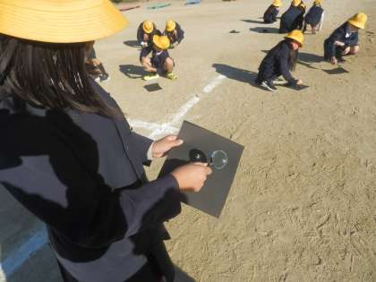 お天気がよかったので、3年生は外で理科の「光のはたらき」の学習をしていました。