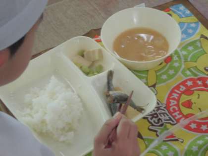 今日の給食のメニューはいわしの生姜煮、みそ汁、高野豆腐の煮物、牛乳、ごはん、でした。いわしの生姜煮はいわしが生姜とこんぶの香りが効いたしょうゆベースのだしで型くずれしないように上手に煮られていました。ごはんとの相性もばっちりでした。みそ汁はだしがしっかりととられていて、やさしい味でした。具材は細かく刻まれた野菜が中心でした。高野豆腐の煮物は少し甘めのだしをしっかりと吸っていて、むきえだまめが添えられていました。