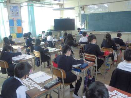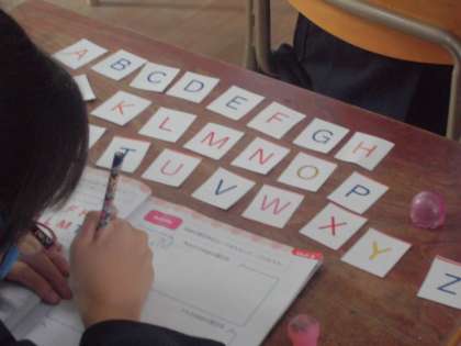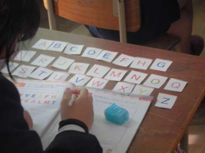 ABCDEFGHIJK・・・・。3年生の子どもたちがアルファベットカードを机の上に並べています。全部言えるかな?自分の名前に使われている文字は?自分の名前を書くことができますか?子どもたちの楽しそうな声が聞こえていました。