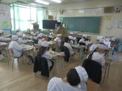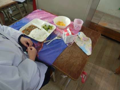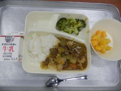 今日の給食は、「冬野菜のカレーライス、ブロッコリーとコーンのサラダ、黄桃」です。カレーライスの中には、だいこんやれんこんなどの冬野菜がたくさん入っています。旬の野菜を食べて寒さに負けないからだをつくろう!!