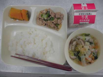 今日の給食のメニューは、豚肉と干しずいきのみそ煮、すまし汁、焼きかぼちゃの甘みつかけ、牛乳、ごはん、でした。豚肉と干しずいきのみそ煮は炒められた豚肉と干しずいきがだしとしょうゆ、みそなどでしっかりと煮含められていました。ずいきとは里芋の茎から作られています。すまし汁はだしがしっかりととられていて、しいたけの香りも効いていて味に深みがありました。鶏肉とにんじん、だいこん、白菜、しいたけ、みつばが入っていました。焼きかぼちゃの甘みつかけは甘くてデザートのような感じに仕上がっていました。