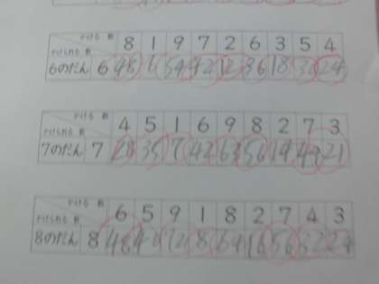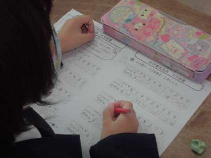 2年生の子どもたちが九九のプリントをしていました。それぞれのだんのかける数がランダムにならんでいるプリントです。子どもたちは楽しそうに取り組んでいました。先生と一緒に答え合わせをしているときも、○をつけるときに正解の「はーい」「はーい」と大きな声で返事をしていました。先生がどれくらいの時間でできたとたずねたときは「ぼくは7分でできたよ」「わたしも7分くらい」「6分くらいでできたで」・・・うれしそうにこたえていました。