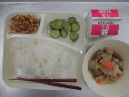 今日の給食のメニューは、鶏肉と野菜の煮物、じゃこ豆、あっさりきゅうり、牛乳、ごはん、でした。鶏肉と野菜の煮物は甘めの和風だしでしっかりと具材を煮含めて、やさしい味に仕上がっていました。鶏肉、にんじん、こんにゃく、ごぼう、たまねぎ、じゃがいも、三度豆が入っていました。じゃこ豆は大豆にでん粉をまぶして油で揚げています。ちりめんじゃこと合わせて、いりごまがふってありました。あっさりきゅうりは塩のみでシンプルでした。