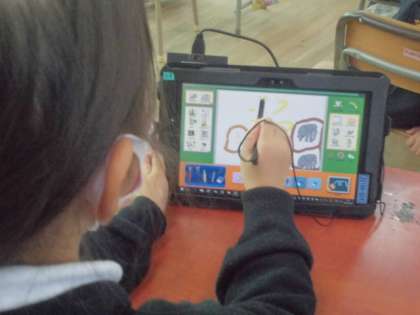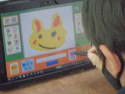 1年生がタブレットを使って、お絵描きをしていました。タッチペンで絵を描いたり色をぬったり、そして消してまた描いたり。「せんせい みてみてー」…、あちこちからお声がかかります。