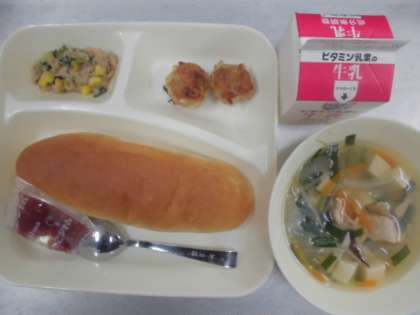 今日の給食のメニューは、揚げシューマイ、豆腐のスープ、ツナとチンゲンサイの炒め物、牛乳、パン、でした。揚げシューマイは皮がカリッと香ばしく揚げられていました。豆腐のスープは中華スープでしいたけとにらの香りが効いていました。ツナとチンゲンサイの炒め物はゆでたチンゲンサイをツナとコーンと一緒に炒めてありました。