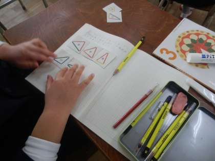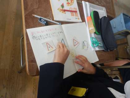 3年生の算数は、辺の長さに目をつけて、三角形のなかまわけを行いました。辺の長さや角の大きさに着目して、同じところや違うところを発表し合い、二等辺三角形や正三角形について知ることができました。