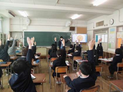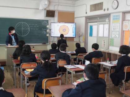 5年生が算数の授業で円に描かれた正多角形の角度を求めていました。先生が大型テレビに映した図を見て、同じ角度はどれかな?、この角度は何度かな?・・・子どもたちは一斉に手を挙げます。はい、はい、はい、当てられるとうれしそうです。前に出て来て、図に描き込んだり説明したりしていました。