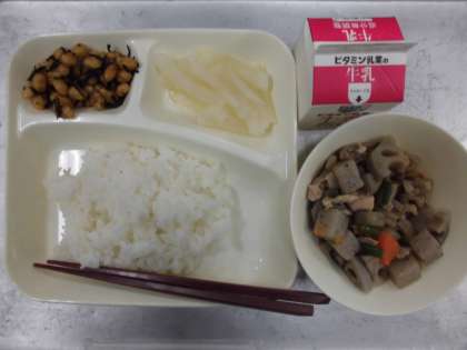 今日の給食のメニューは筑前煮、ひじき豆、大根のゆず風味、牛乳、ごはん、でした。筑前煮はしいたけのもどし汁を使った甘めの和風だしで具材をしっかりと煮含めてありました。鶏肉、にんじん、ごぼう、れんこん、しいたけ、こんにゃく、三度豆が入っていました。ひじき豆はでん粉をまぶして揚げられた大豆にひじきと甘辛だれがからませてありました。大根のゆず風味はゆずの香りが効いていてさっぱりとしていました。