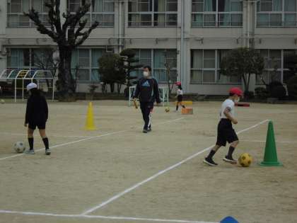 2年生の子どもたちが運動場でサッカーの練習です。