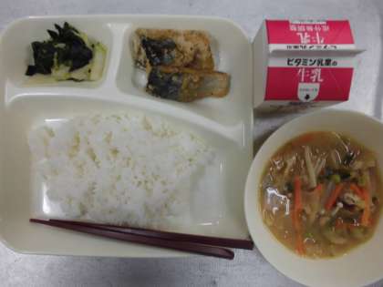 今日の給食のメニューはさばのカレー竜田揚げ、さつまいもとうすあげのみそ汁、白菜とほうれん草の煮びたし、牛乳、ごはん、でした。さばのカレー竜田揚げはカレー粉で風味付けしてあり、ころもがサクサクしていて上手に揚げられていました。さばの身も厚くおいしかったです。さつまいもとうすあげのみそ汁はだしがしっかりととられていて、さつまいもの甘みがみそ汁にとけ出していました。白菜とほうれん草の煮びたしは薄味でやさしい味つけでした。