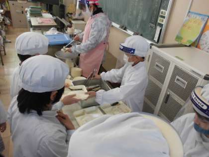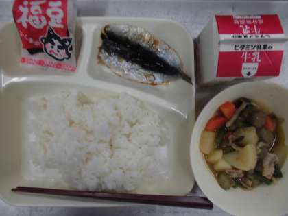 今日の給食のメニューはいわしの生姜醤油かけ、含め煮、いり大豆、牛乳、ごはん、でした。節分メニューです。いわしの生姜醤油かけは手づくりの生姜醤油だれがかけられていて、ごはんとよく合いました。いわしの身はやわらかく、小骨もそのまま全部食べられました。含め煮は少し甘めの和風だしで豚肉、にんじん、ごぼう、大根、じゃがいも、しめじ、三度豆がしっかりと煮含められていてやさしい味わいでした。いり大豆は「福豆」という袋に入れられていて縁起がよさそうです。