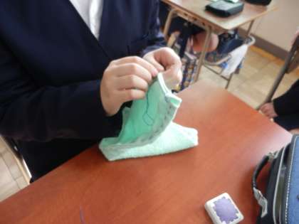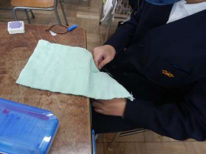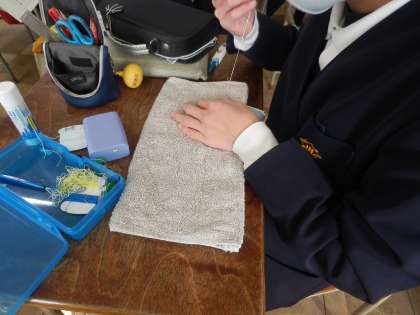 6年生は、在校生に向けて雑巾を縫っています。一針一針 心を込めて縫うことができています。