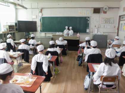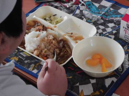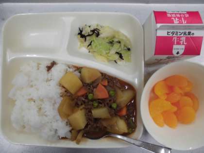 今日の給食のメニューはハヤシライス、キャベツのひじきドレッシング、みかん(缶)、牛乳、でした。ハヤシライスは手づくりのまろやかなルウに牛肉の旨みも合わさり、野菜もたくさん入っていました。じゃがいもがホクホクしていました。キャベツのひじきドレッシングはほんのりと甘酸っぱくさっぱりとしたドレッシングがかけられていました。みかん(缶)は子どもたちも大好きです。