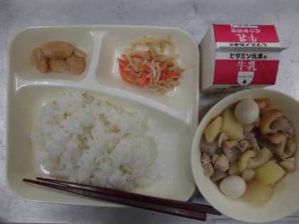 今日の給食のメニューは関東煮、甘酢和え、白花豆の煮物、牛乳、ごはん、でした。関東煮は甘めの和風だしで具材がしっかりと煮込まれていて味がしみ込んでいておいしかったです。甘酢和えは細かく刻まれたにんじんともやしが砂糖や米酢で味つけられていてさっぱりとしていました。白花豆の煮物は甘くてやわらかくデザートのようでした。