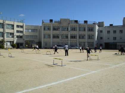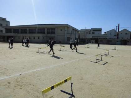 5年生が体育の授業でハードル走をしていました。自分の跳びやすいリズムや歩数をさがしながら練習していました。だんだんリズムよくスムーズに跳べるようになってきました。あまり高く跳びすぎず、前へ向かう感じで跳んでいくのがハードル走のポイントです。先生がなんどもがんばれーと声をかけていました。