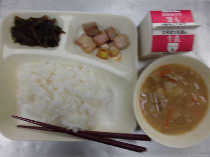 今日の給食のメニューは、まぐろの甘辛焼き、豚汁、茎わかめの佃煮、牛乳、ごはん、でした。まぐろの甘辛焼きは甘辛い醤油だれがまぐろによくからんで白ねぎの風味も感じられました。豚汁はだしがしっかりととられたみそ汁に豚肉の旨みがとけ出していて、野菜もたくさん入っていました。茎わかめの佃煮は茎わかめのコリコリした食感が楽しめました。