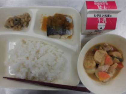 今日の給食のメニューは、さごしのおろし醤油かけ、一口がんもと里芋の味噌煮、れんこんの炒め物、牛乳、ごはん、でした。さごしのおろし醤油かけはさごしは身が厚くて骨もあまりなく食べやすかったです。おろし醤油がとてもおいしく、ごはんとよく合いました。一口がんもと里芋の味噌煮は一口がんもやそのほかの具材にみその味がしみていて、里芋もおはしでわれるほどやわらかく煮込まれていました。れんこんの炒め物はシャキシャキとしたれんこんの食感が楽しめました。