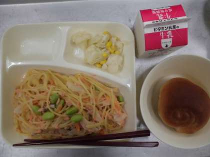 今日の給食のメニューは、鮭のクリームスパゲッティ、カリフラワーとコーンのサラダ、牛乳、パン、でした。鮭のクリームスパゲッティは具材に鮭、しめじ、ベーコン、にんじん、たまねぎ、むきえだまめが入ったクリーミーなソースがほどよいかたさにゆでられたスパゲッティによくからんでおいしかったです。鮭の風味が効いていました。カリフラワーとコーンのサラダはほんのり甘酸っぱくさっぱりとしたドレッシングがかけられていました。