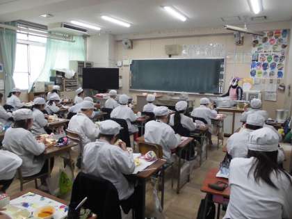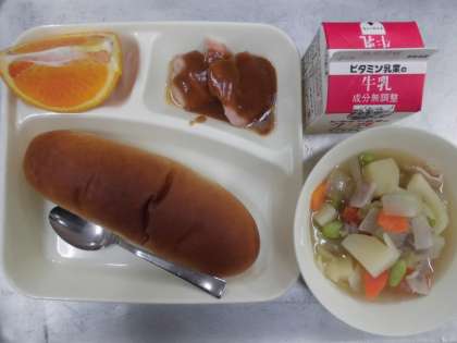 今日の給食のメニューは、鶏肉のみそバターソース、スープ煮、デコポン、牛乳、パン、でした。鶏肉のみそバターソースは香ばしく焼き上げた鶏肉に赤みそ、八丁みそ、砂糖、バター、でん粉で作ったとろみがかった特製ソースがかけられていておいしかったです。スープ煮はチキンスープをベースに塩こしょう、しょうゆで味をととのえ、具材もたくさん入っていました。デコポンは果汁が多く甘かったです。
