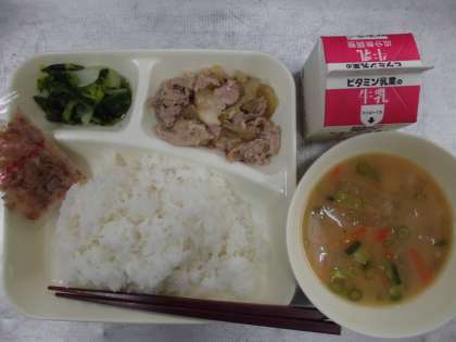 今日の給食のメニューは、豚肉の生姜焼き、豆腐のみそ汁、菜の花のおひたし、牛乳、ごはん、でした。豚肉の生姜焼きはしっかりと下味がついていて風味豊かに焼き上げられていました。ごはんともよく合いました。豆腐のみそ汁はだしが効いていて、やさしい味でした。豆腐のほかにも野菜がたくさん入っていました。菜の花のおひたしはかつおぶしをかけて食べました。