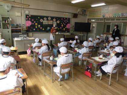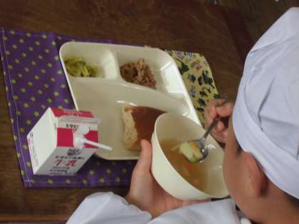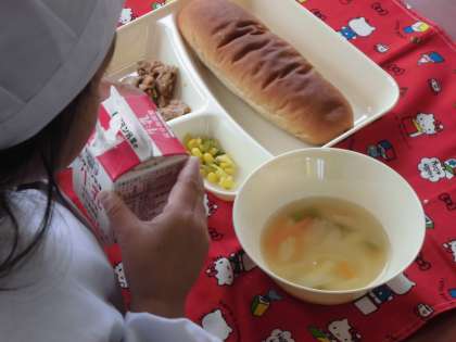 みんなおとなしく静かに給食が並べられるのを待っていました。えらいですね。「おにくにソースがかかってる」「わたしやさいすき」「コーンがはいってる」「これってなにスープ?」「ストローってどこにさすの?」「もうたべていいの?」・・・1年生ははじめての給食も目がキョロキョロです。楽しいですね。それでは、いただきまーす。