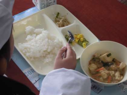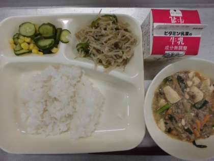 今日の給食のメニューは、麻婆豆腐、きゅうりとコーンの甘酢和え、もやしとピーマンのごま炒め、牛乳、ごはん、でした。麻婆豆腐は牛豚ひき肉やにんじん、たまねぎがにんにくやトウバンジャンと一緒に香りよく炒められていて、にらの香りも効いていました。ほどよいっとろみ加減でごはんがすすみました。きゅうりとコーンの甘酢和えはさっぱりとした口あたりで、もやしとピーマンのごま炒めもおいしかったです。