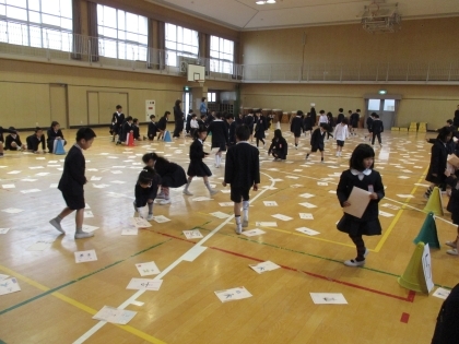 1年生と2年生が合同でカルタ大会を講堂で行いました。読み上げられた字札と合う絵札をさがします。絵札は普通のカルタよりずいぶん大きく作ってありました。