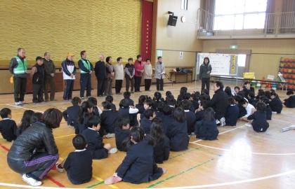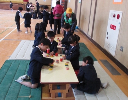 地域の方々に来ていただき、1年生が昔遊びを教えていただきました。コマ、だるま落とし、ヨーヨー、紙飛行機、竹とんぼ、折り紙、お手玉、あやとりなどたくさんの昔遊びを体験しました。