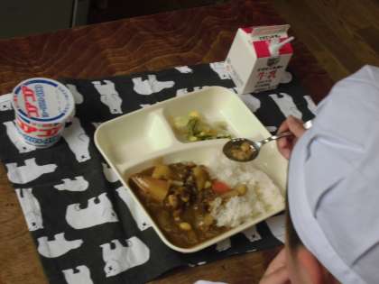 今日の給食のメニューは、牛肉と大豆のカレーライス、レタスとコーンのサラダ、ヨーグルト、牛乳、でした。牛肉と大豆のカレーライスは牛肉やたまねぎがにんにくと一緒に香りよく炒められていて、じゃがいもやにんじんもホクホクしていてやわらかかったです。大豆も入っていて栄養ばっちりです。レタスとコーンのサラダは甘酸っぱくリンゴ酢が効いていました。ヨーグルトは一人一個です。