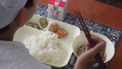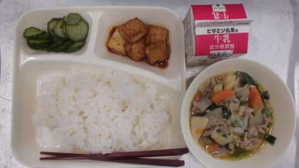 今日の給食のメニューは、中華煮、厚揚げのピリ辛じょうゆかけ、きゅうりの中華和え、牛乳、ごはん、でした。中華煮は豚肉、たけのこ、にんじん、たまねぎ、キャベツ、にらが入っていて具だくさんでした。とろみ具合もちょうどよく、ごはんとよく合いました。厚揚げのピリ辛じょうゆかけはトウバンジャンとしょうゆを合わせたタレが厚揚げにかけられていました。きゅうりの中華和えはあっさりとしてした味に仕上がっていました。