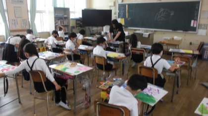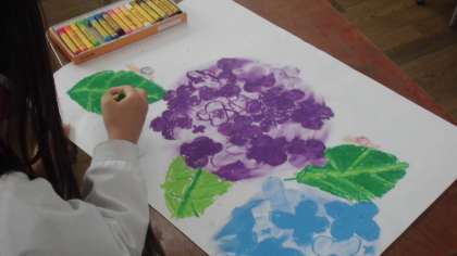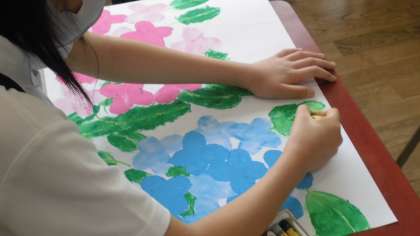 3年生は図画工作の時間に季節の花(あじさい)を描いていました。あじさいの花は、型の上からクレパスでしっかりと塗り、クレパスがはみ出た部分を指でこすってぼかしながら描きました。教室にきれいなあじさいが咲き誇っています。