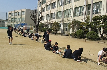 もうすぐ卒業する6年生が、母校を少しでもきれいにしておこうと奉仕活動をしてくれました。管理作業員さんや担任の先生といっしょに、運動場の側溝にたまった砂や土をすくってきれいにしました。