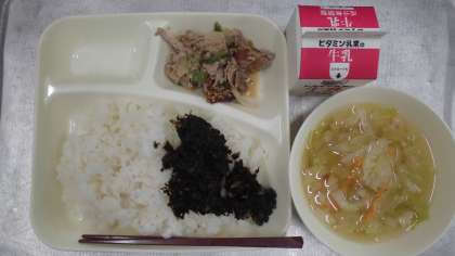 今日の給食のメニューは、豚肉のごまみそ焼き、すまし汁、のりの佃煮、牛乳、ごはん、でした。豚肉のごまみそ焼きはごまみそだれでしっかりと豚肉、たまねぎ、ピーマンに下味をつけて、香ばしく焼き上げられていました。ごはんとの相性もばっちりでした。すまし汁はだしが効いた透明感のあるスープに鶏肉、にんじん、キャベツ、たけのこが入っていました。のりの佃煮はしいたけの香りがしておいしかったです。