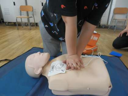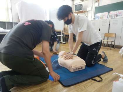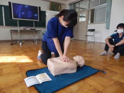 プールの学習が始まる前に、救命救急講習を行いました。都島消防署からお借りしたDVDを視聴したあと、実際にAEDや人体模型を使って、その使用方法や心臓マッサージの仕方等について学びました。